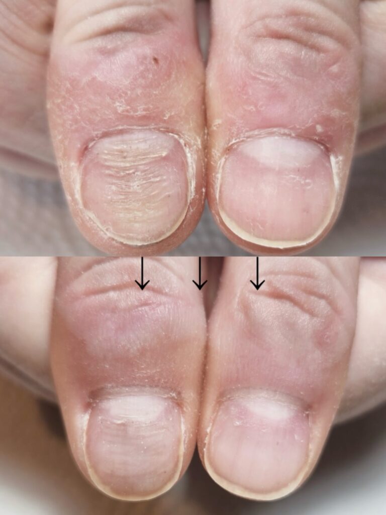 赤みが強く皮膚がめくれやすかった状態から、甘皮周りが柔らかく整ってきました。