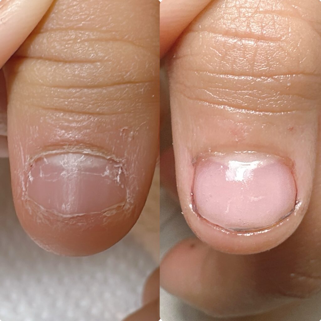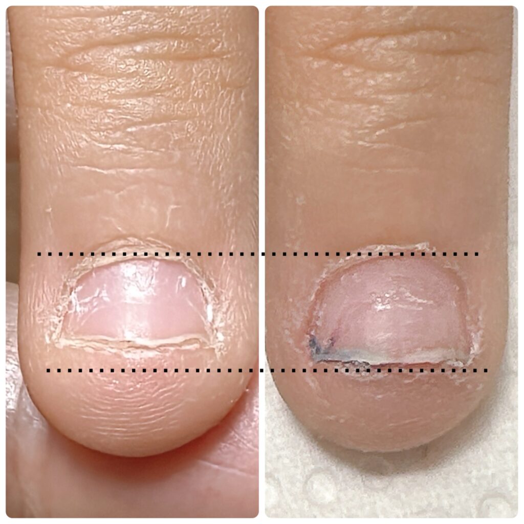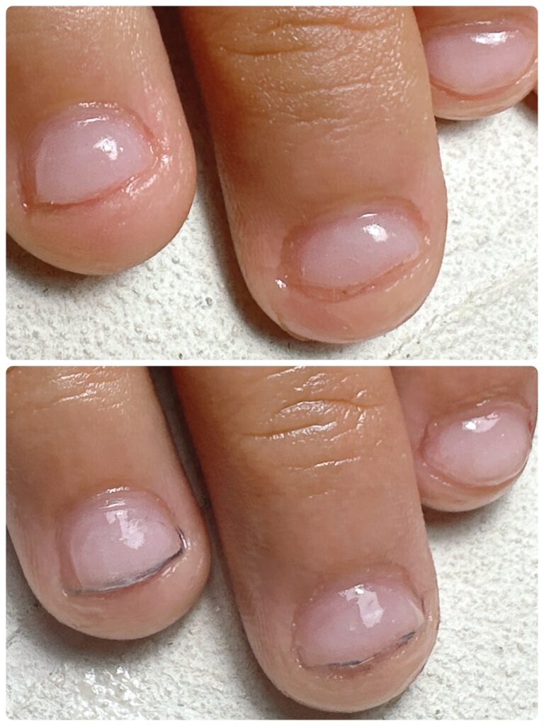 A. 深爪の度合いと治したい気持ちなどの個人差はありますが、通常は2ヶ月から半年ほどかけて、爪の生え変わりサイクルに合わせて改善していきます。