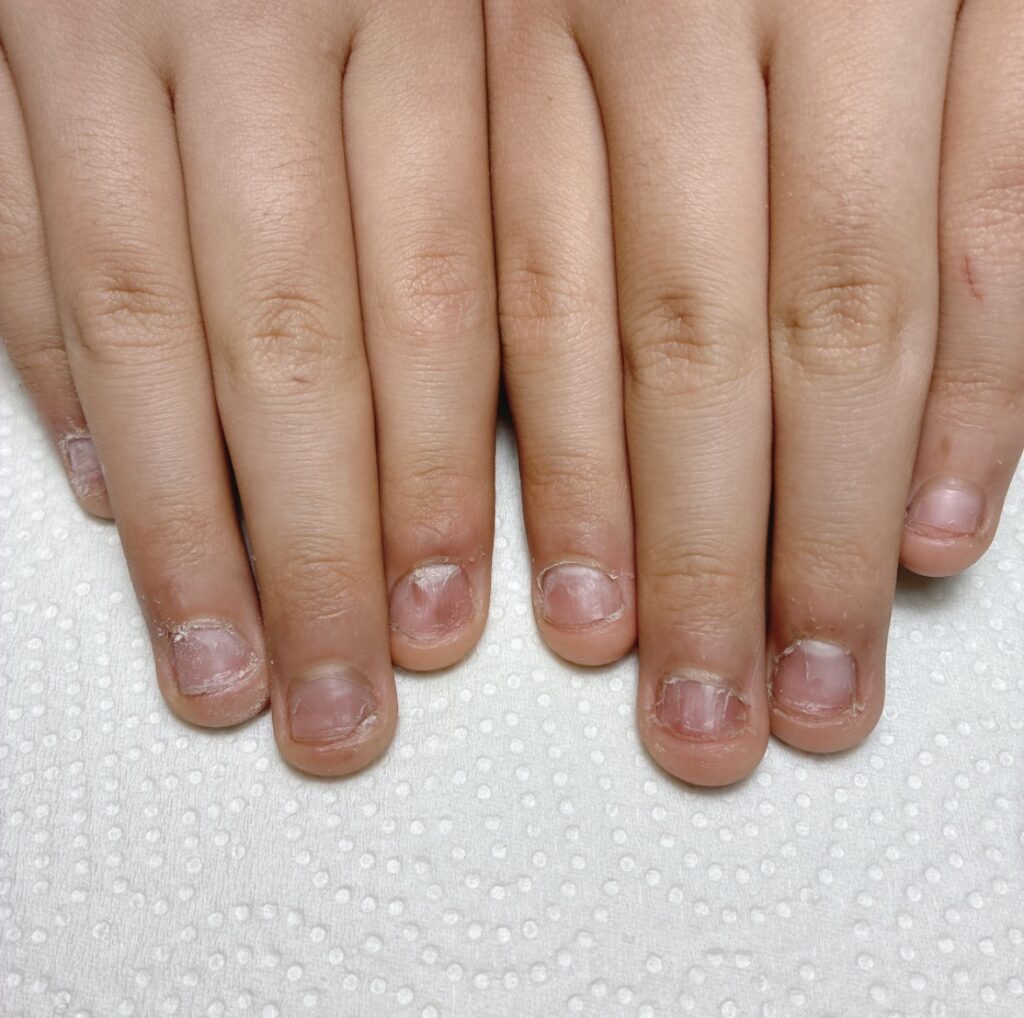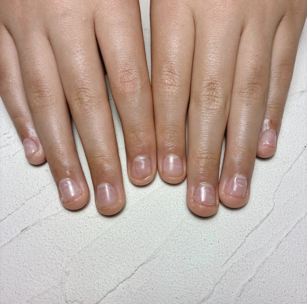 施術前は、爪の長さが不揃いで、全体的に短く見える状態でした。